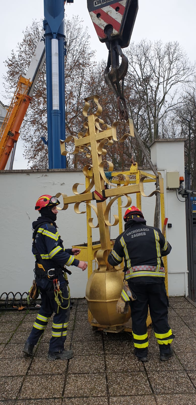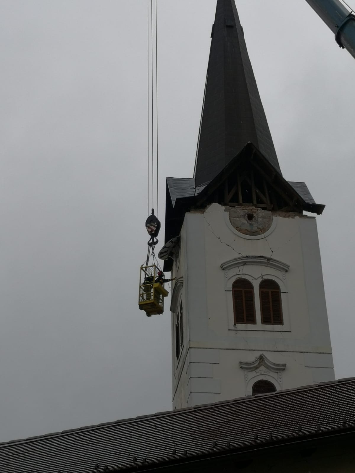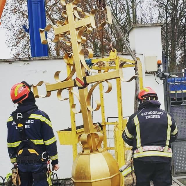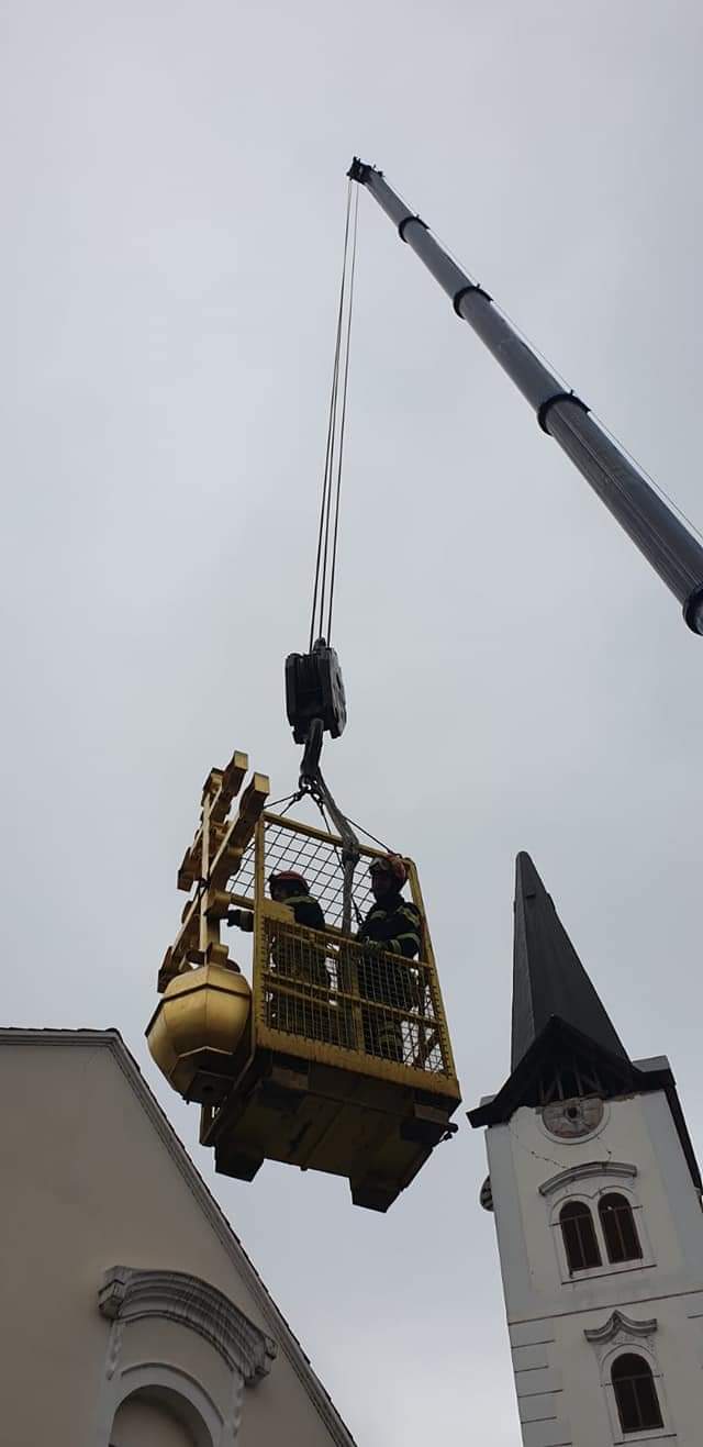 Započeli smo uklanjanje tornja sa zvonika katedrale u Sisku. Skidanje se radi u fazama. Prva faza je uklanjanje ostataka žbuke i cigle te osiguranje gurtnama zidanog zvonika od urušavanja. Druga faza je skidanje križa sa tornja i treća faza osiguranje samog tornja i skidanje istog u cijelosti. Skidanje tornja vrši se na sličan način kao i na Zagrebačkoj katedrali. Danas se planira izvršiti treća faza uklanjanja cijelog tornja, i nakon toga uklanjanje zvona iz zvonika. Radove izvode djelatnici JVP grada Zagreba, specijalistički tim za spašavanje iz dubina i s visina. Spašavanje iz ruševina odrađuje se u suradnji sa JVP Grada Siska, poduzećem Mamut Zagreb, PU Sisačko-moslavačka i djelatnika župe, rekao je zapovjednik Javne vatrogasne postrojbe Grada Zagreba Siniša Jembrih.